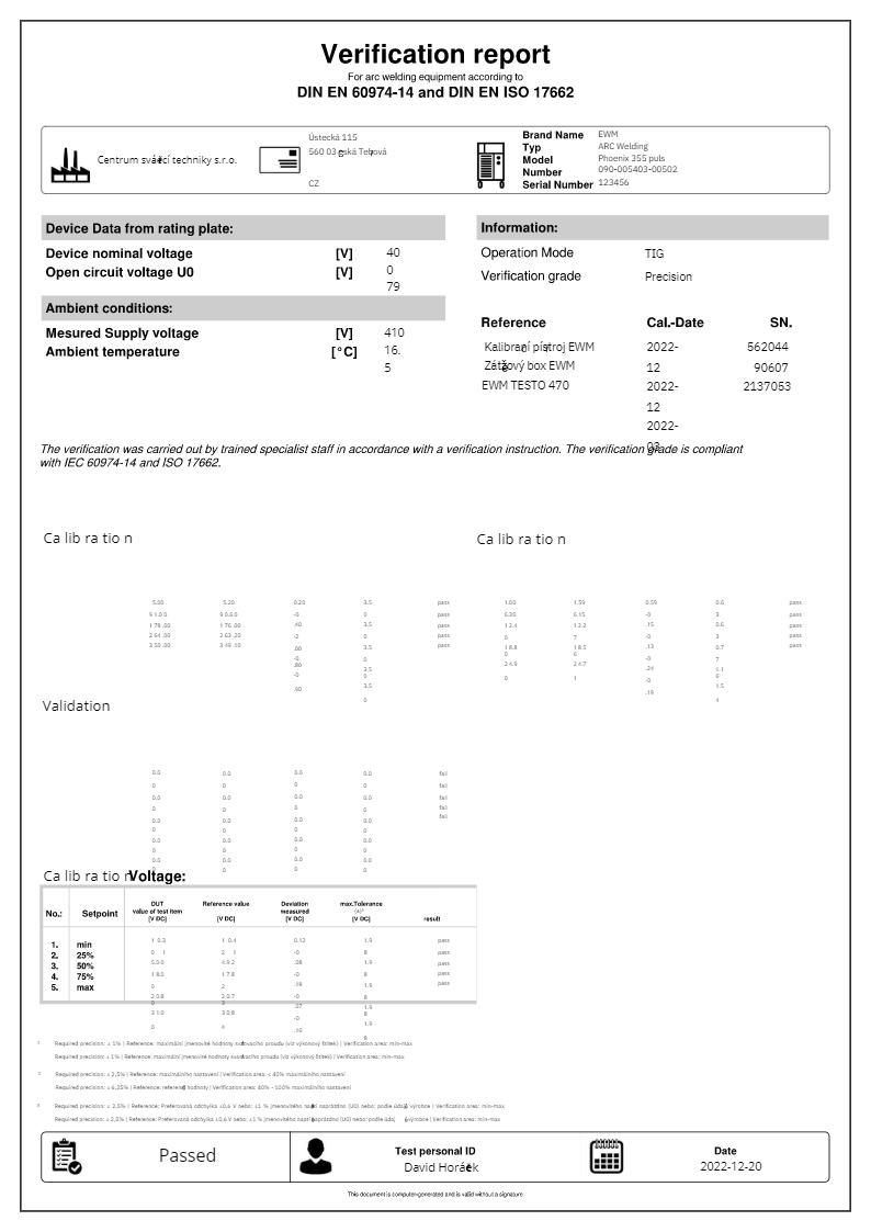 Součástí certifikace svařování je proces kalibrace/validace. Postupujeme dle kalibračního postupu, který obsahuje metodiku postupů kalibrace svařovacích zařízení. Výstupem kalibrace je „kalibrační a validační protokol„. Kalibrace a validace zdrojů svařovacího proudu jsou prováděny dle platných norem ČSN EN IEC 60974-14:2018 a ČSNEN ISO 17662.